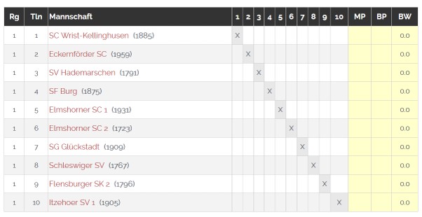 ... hatten wir nach der Auslosung und vor der 1. Runde (siehe Bild). Demnach empfingen wir im ersten Heimspiel der Saison den Tabellenletzten aus Itzehoe. Dass die zufällige Auslosung der Startranglistenposition wirklich nur zufällig ist und nichts mit der tatsächlichen Spielstärke einer Mannschaft zu tun hat, konnten wir heute aber erfolgreich beweisen. Am Ende des Spieltages führten wir durch eine 7,5:0,5-Niederlage eine große Rochade in der Tabelle mit Itzehoe durch (aber immerhin ist ja auch in der 10 eine 1 enthalten).